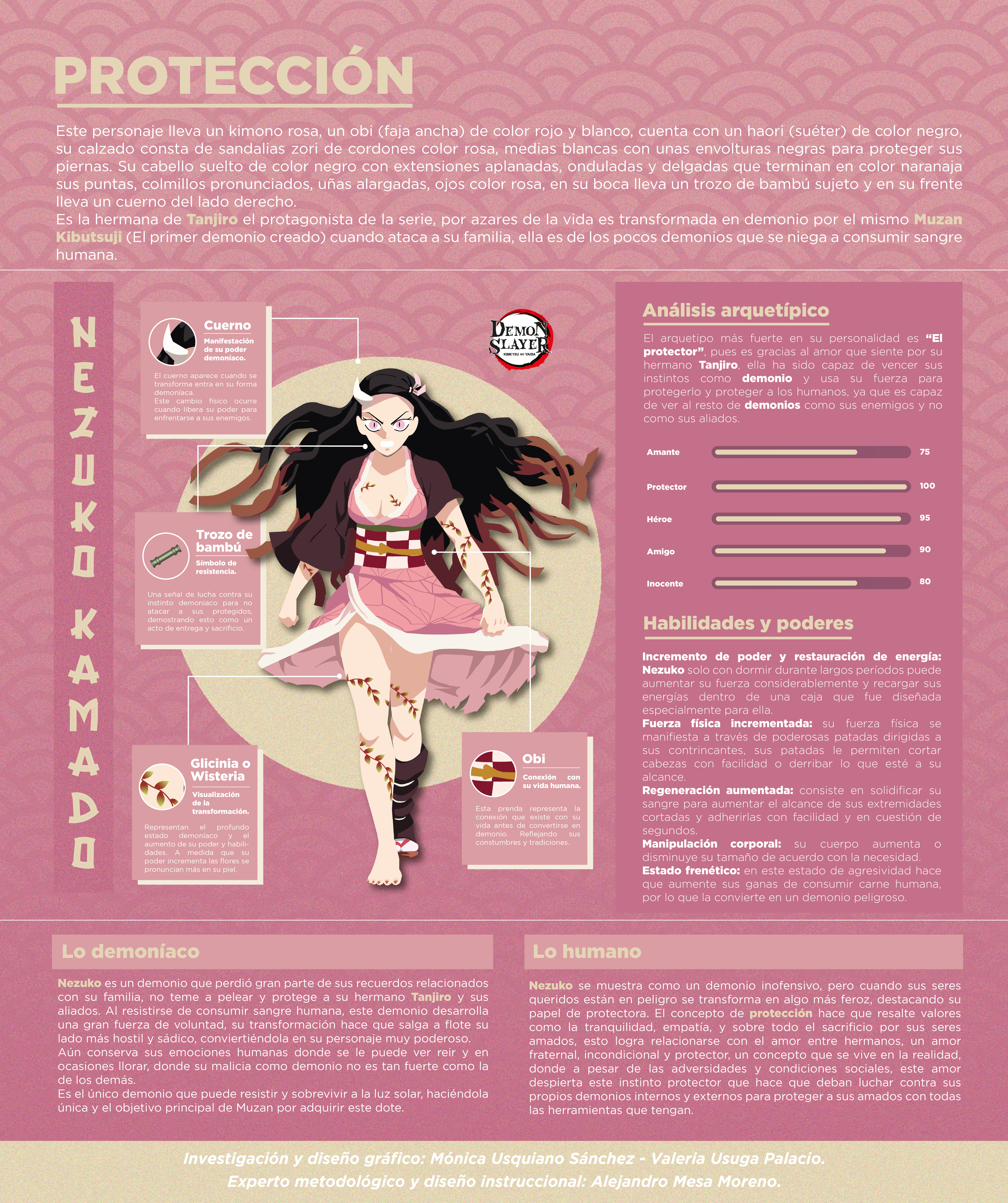 La infografía se enfoca en la representación de conceptos psicológicos, culturales y narrativos a través de medios gráficos, como es la naturaleza humana y su lucha interna, así como y la protección a la familia.