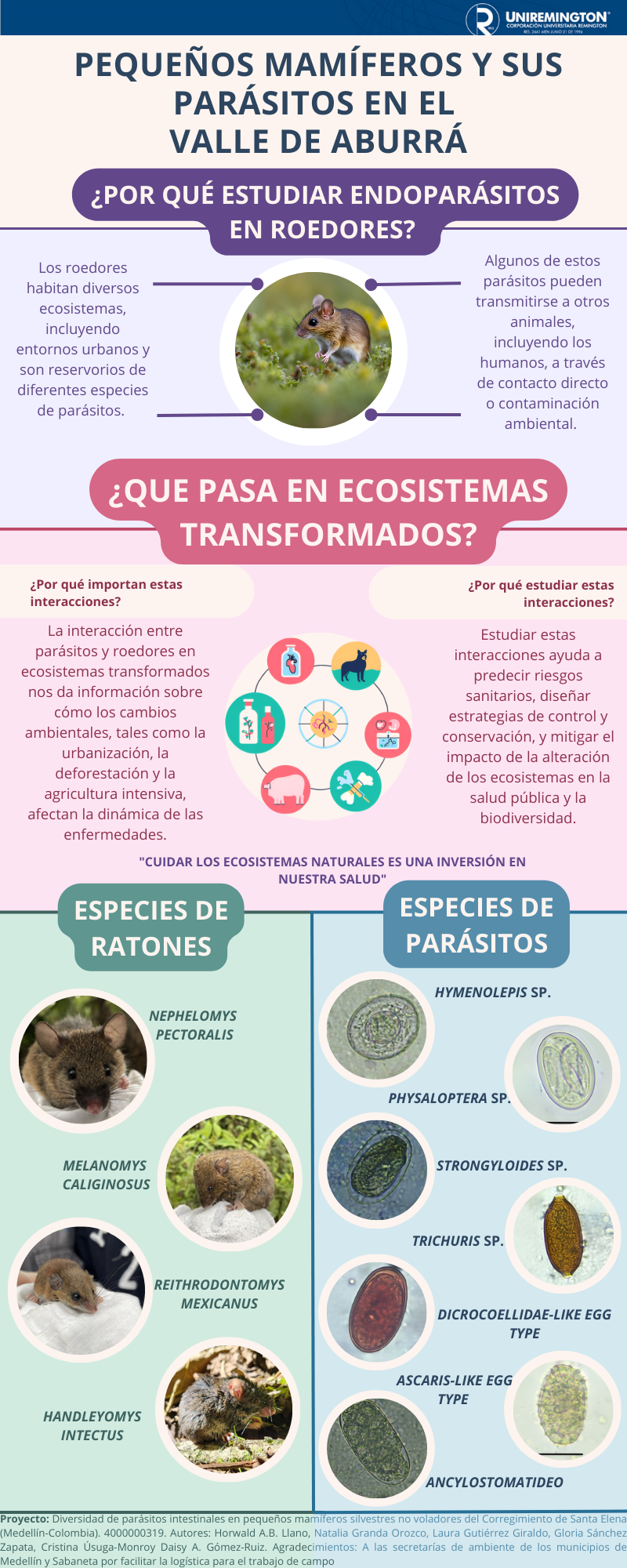 Esta infografía presentan parte de los resultados del proyecto "Diversidad de parásitos intestinales en pequeños mamíferos silvestres no voladores del Corregimiento de Santa Elena (Medellín-Colombia)", principalmente los hallazgos obtenidos en el muestreo de materia fecal de roedores y su análisis coproparasitológico. Esta infografía pretende acercar a un publico no académico, con el conocimiento sobre la biodiversidad de parásitos asociados a la fauna presente en zonas rurales e intervenidas del Valle de Aburrá. Esta infografía se circulara a través de redes sociales y páginas web, pero también será entregada de forma física como poster para la comunidad asociada al área de estudio