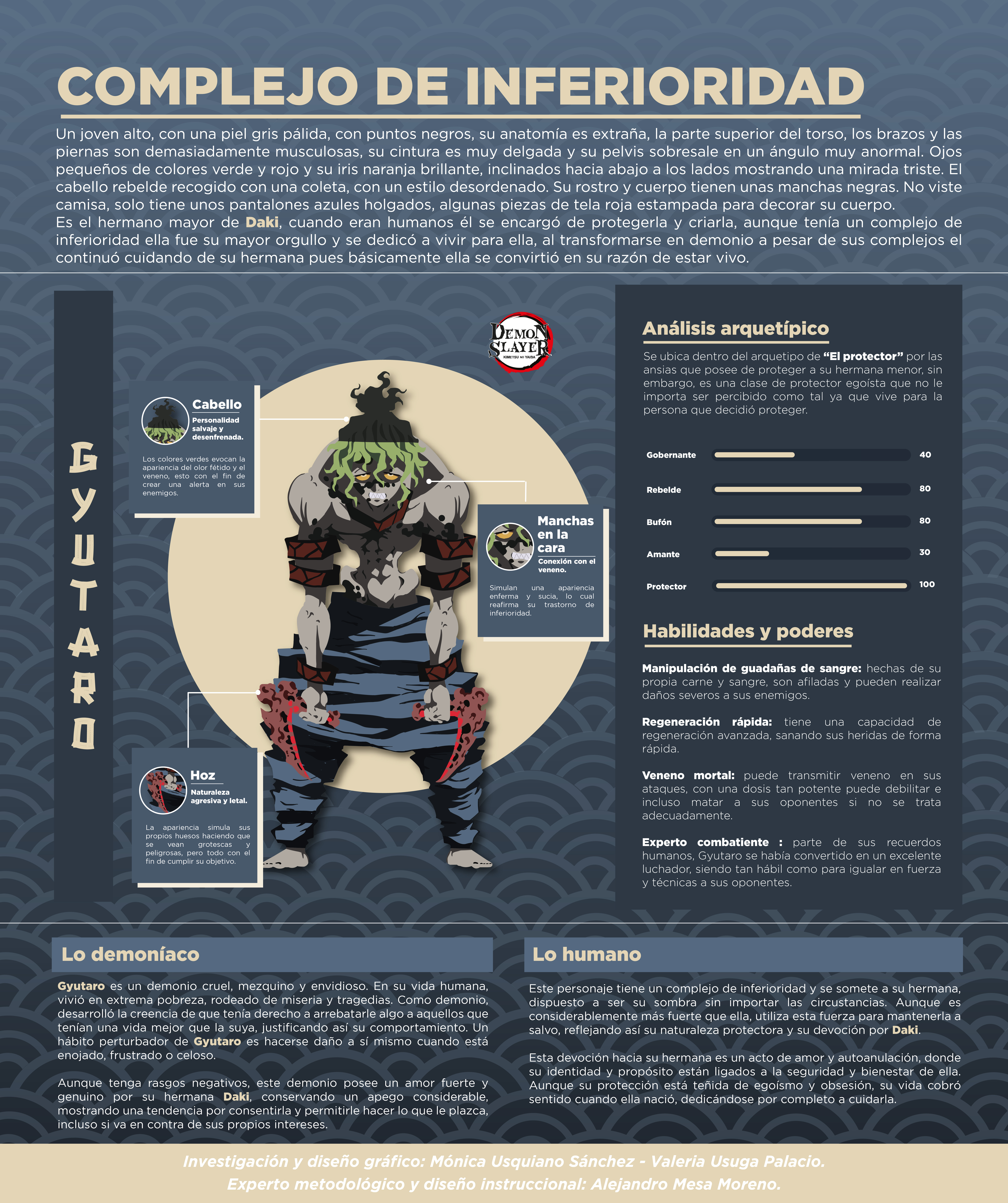 La infografía se enfoca en explicar el complejo de inferioridad mediante el análisis de elementos presentes en la ilustración del personaje como son el cabello, las manchas en la cara, el uso de hoz, así como la presencia de habilidades de manipulación, regeneración y experticia en combate entre otros.