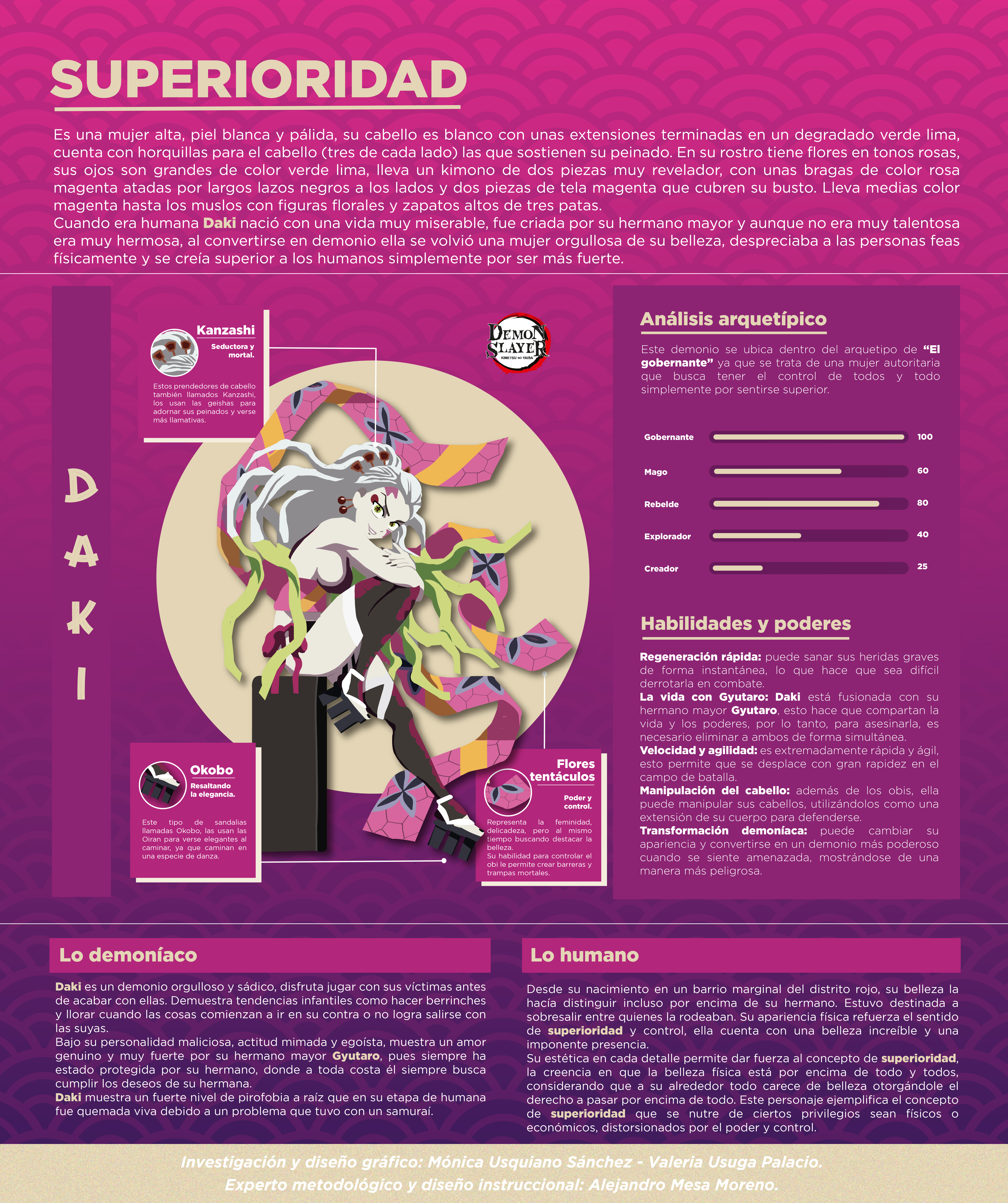 La infografía se enfoca en explicar al superioridad a través de los simbolismos que supone el uso de prendedores de cabello, sandalias okobo, las flores y téntáculos, así como los poderes de regeneración, velocidad, transformación,entre otros.