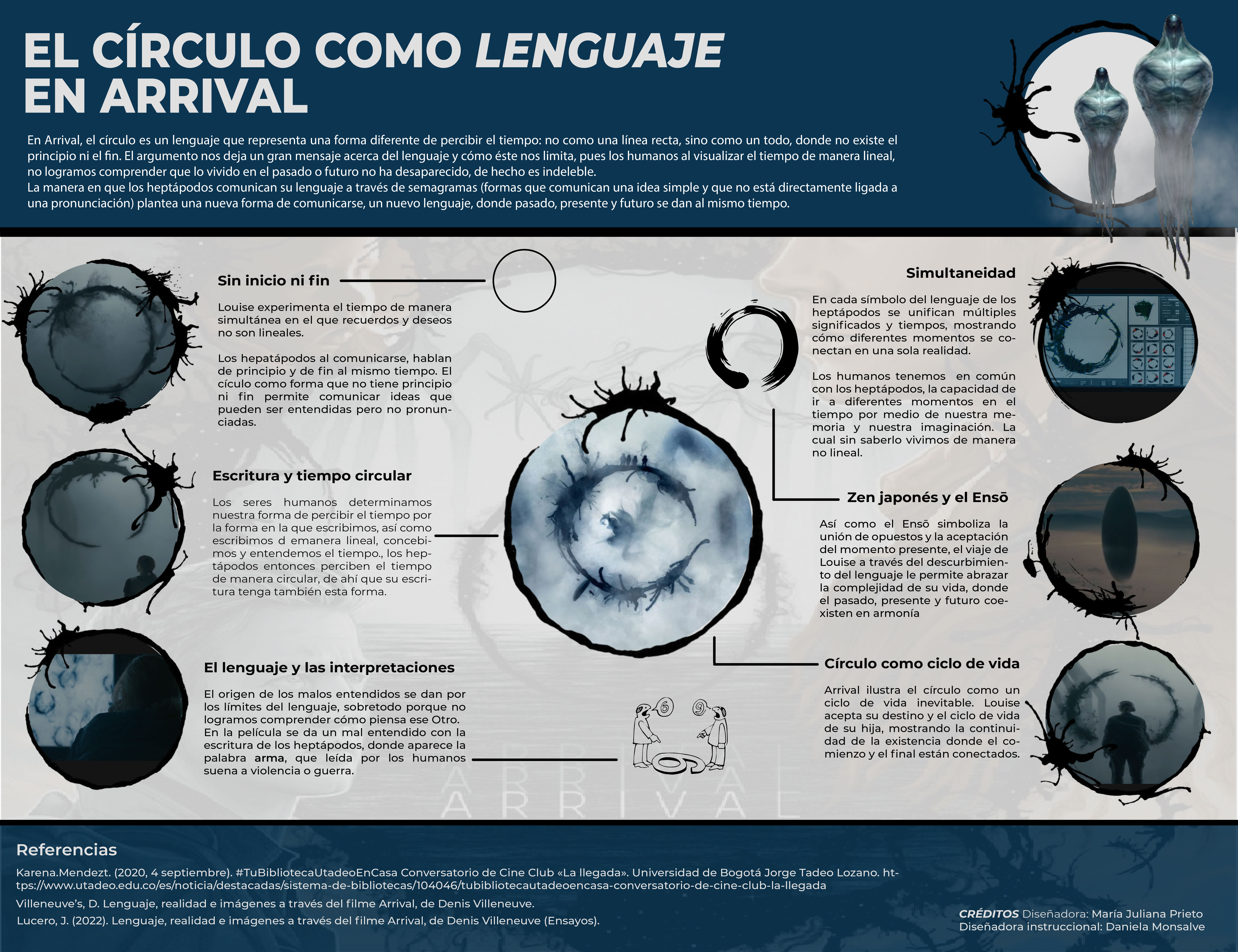 La publicación está compuesta por una inforgrafía que analiza aspectos del argumento de la película arrival y cómo el "círculo" toma una relevacia dentro del argumento gracias a los símbolos culturales, temas, conceptos y otros relacionados a esta figura geométrica. La infografía describe cómo el círculo es abordado como un lenguaje diferente al humano y cómo este lenguaje condiciona también una forma diferente a la humana de percibir el tiempo. La infografía se acompaña de un texto que aborda otros aspectos del círculo, que lo presentan, lo describen y además que introducen a la inforgrafía.